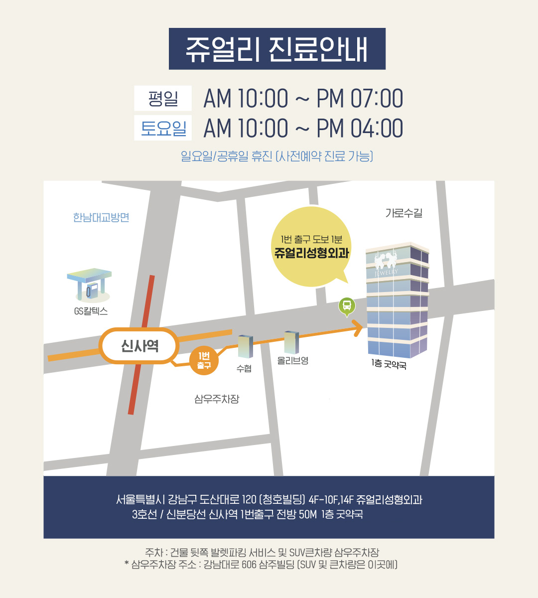 쥬얼리 진료 안내 평일 AM 10:00 ~ PM 07:00 토요일 AM 10:00 ~ PM 04:00 ※ 일요일/공휴일 휴진 (사전 예약 진료가능) 서울특별시 강남구 도산대로 120 (청호빌딩) 4F~10F,14F 쥬얼리성형외과 3호선 / 신분당선 신사역 1번출구 전방 50M 1층 굿약국 ※ 건물 뒤쪽 기계식 주차 발렛파킹 서비스 및 삼우주차장 (삼우주차장 주소 : 강남대로 606 삼주빌딩)
